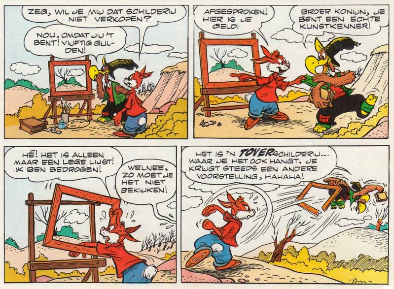 In de strip van 20 februari 1949 doet hij bijvoorbeeld alsof hij een schilderij verft, maar in werkelijkheid zie je de horizon door een lege lijst. En wat denk je? Broer Konijn koopt het doek voor vijftig gulden! Nou, tegenwoordig zijn de rollen meestal omgedraaid!